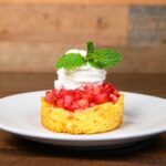 Brown butter cake with macerated strawberries, whipped cream and fresh mint.