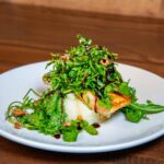 Seared salmon with mashed potatoes and arugula tossed in a lemon vinaigrette with grated parmesan, candied walnuts and a balsamic reduction.