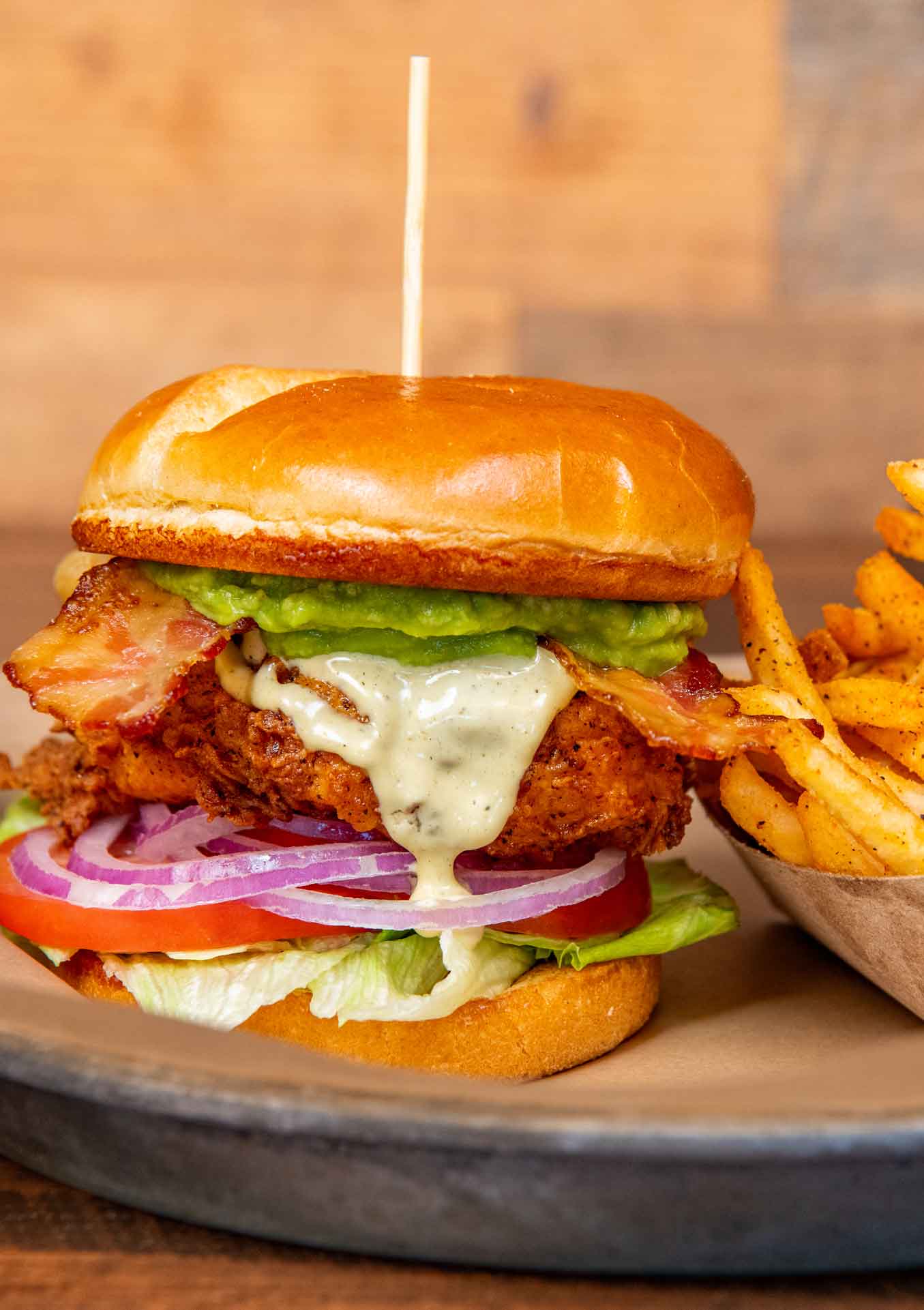 Fried chicken breast with pickle & garlic aioli on a toasted brioche bun.