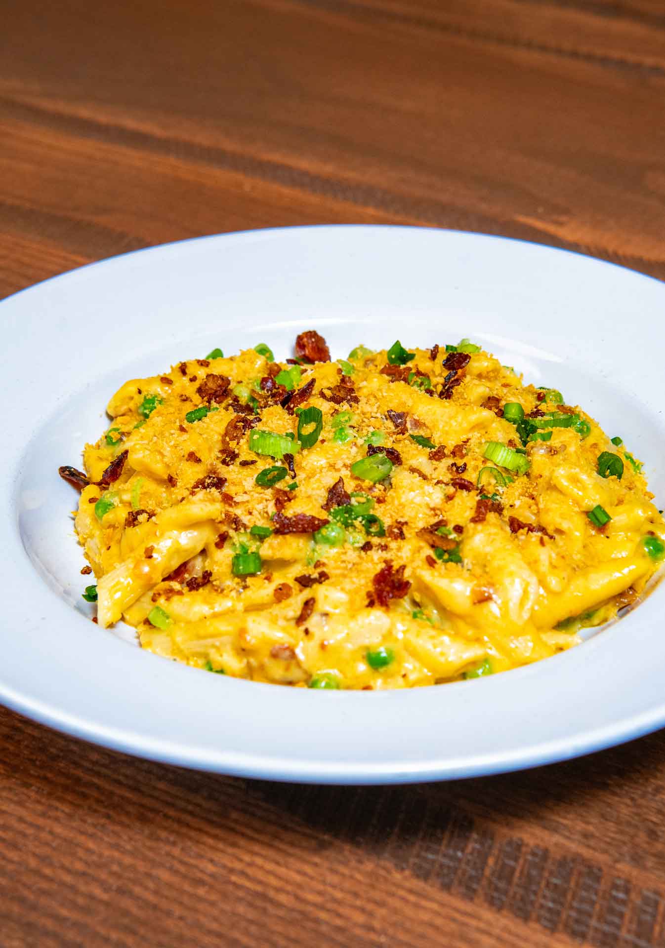 Penne pasta in a cheddar, parmesan and blue cheese cream sauce with peas, crumbled bacon, toasted bread crumbs and green onion.